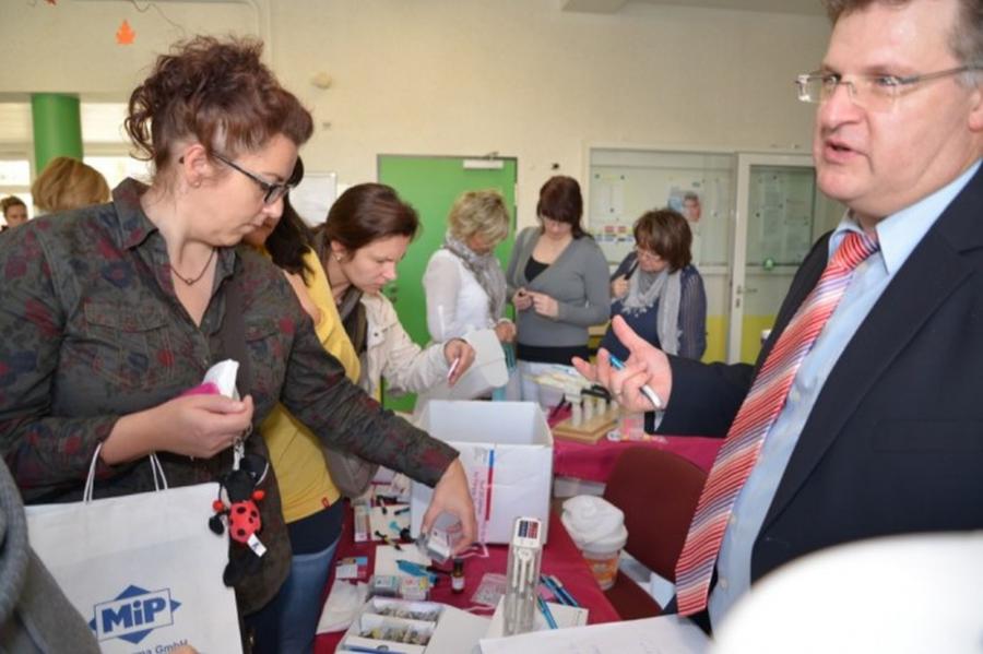 Während des wissenschaftlichen Programms für die Zahnärzte in der Aula bildeten sich die zahnärztlichen Fachangestellten in der Bibliothek der Schule weiter. Herr Becker zeigte in seinem Vortrag „Infektionsprävention in der Zahnheilkunde – Anforderung an die Hygiene“ die modernen, zahlreichen Möglichkeiten für die Praxis. Im zweiten Vortrag von Herrn Martenson wurde erneut die zentrale Rolle des Patienten „als willkommener Gast und Kunde“ herausgestellt.